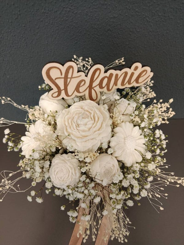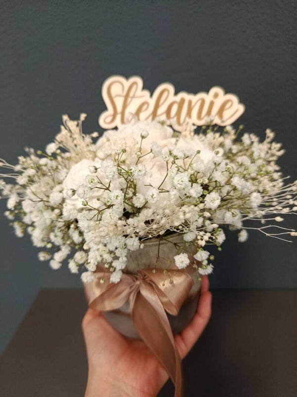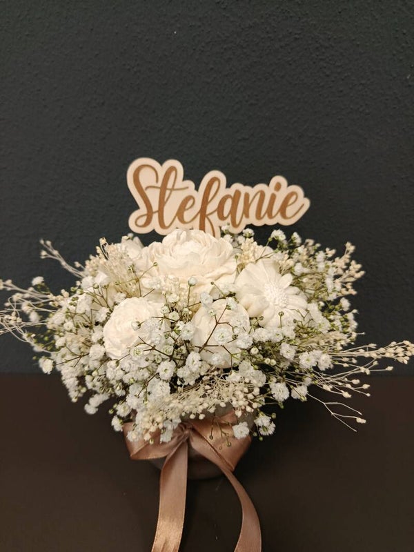 Personalisierung (Topper): Der abgebildete Holz-Topper mit dem Namen (z. B. Stefanie) ist handgefertigt und kann auf jeden beliebigen Namen oder eine kurze Botschaft personalisiert werden.