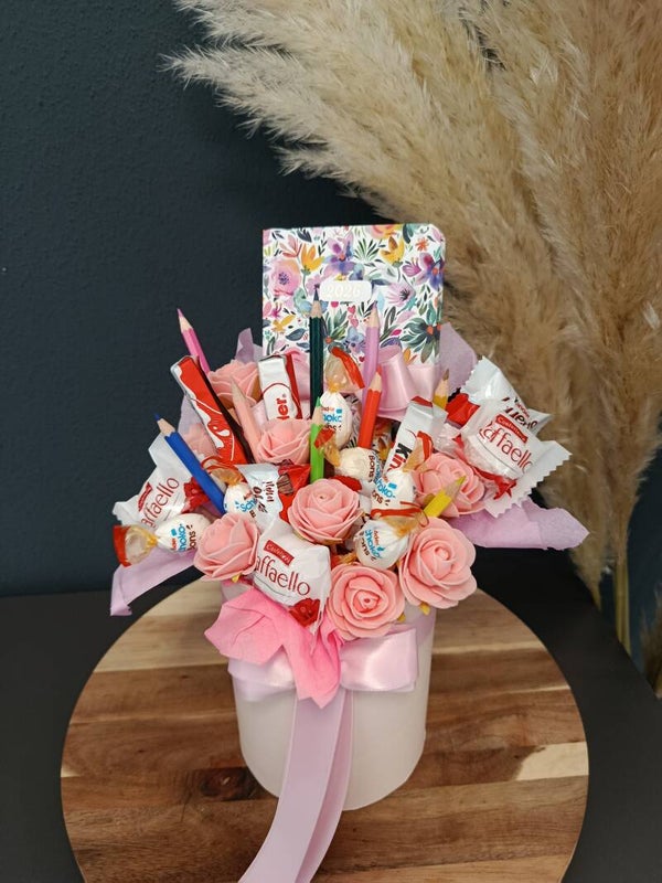 Was diese Box so besonders macht: Doppelt so schön: Gefüllt mit beliebten Leckereien wie Raffaello und Kinder Schokolade für den sofortigen Nasch-Spaß. Kreative Ecke: Ein Notizbuch im fröhlichen Blumenmuster und mehrere bunte Buntstifte laden zum Malen, Schreiben und Träumen ein. Mädchen-Charme: Zarte, rosafarbene Deko-Rosen und das elegante Satinband verleihen dem Arrangement eine besonders liebevolle und feminine Note. Fertig zum Verschenken: Alles ist kunstvoll in einer weißen Geschenkschachtel arrangiert – einfach überreichen und strahlende Augen ernten!